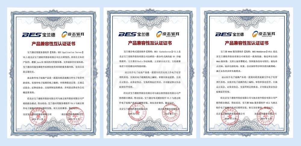 近日,凌志軟件電子底稿產品成功與寶蘭德應用服務器V9.5、分布式緩存軟件V3.2、Web服務器軟件V3.1完成兼容性互認證。經過北京寶蘭德軟件股份有限公司與凌志軟件的嚴密聯合測試表明,凌志軟件電子底稿產品與上述中間件良好兼容,實現順利安裝、穩定運行。