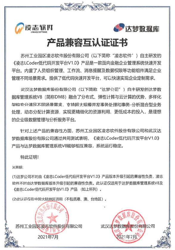 凌志軟件又一產品——凌志LCoder低代碼開發平臺軟件V1.0完成了與銀河麒麟高級服務器操作系統V10(兆芯版、海光版、AMD64版)兼容性互認證測試,達到通用兼容性要求及性能、可靠性要求,滿足用戶實現應用的關鍵性需求,并與達夢數據庫管理系統V8通過互認證。