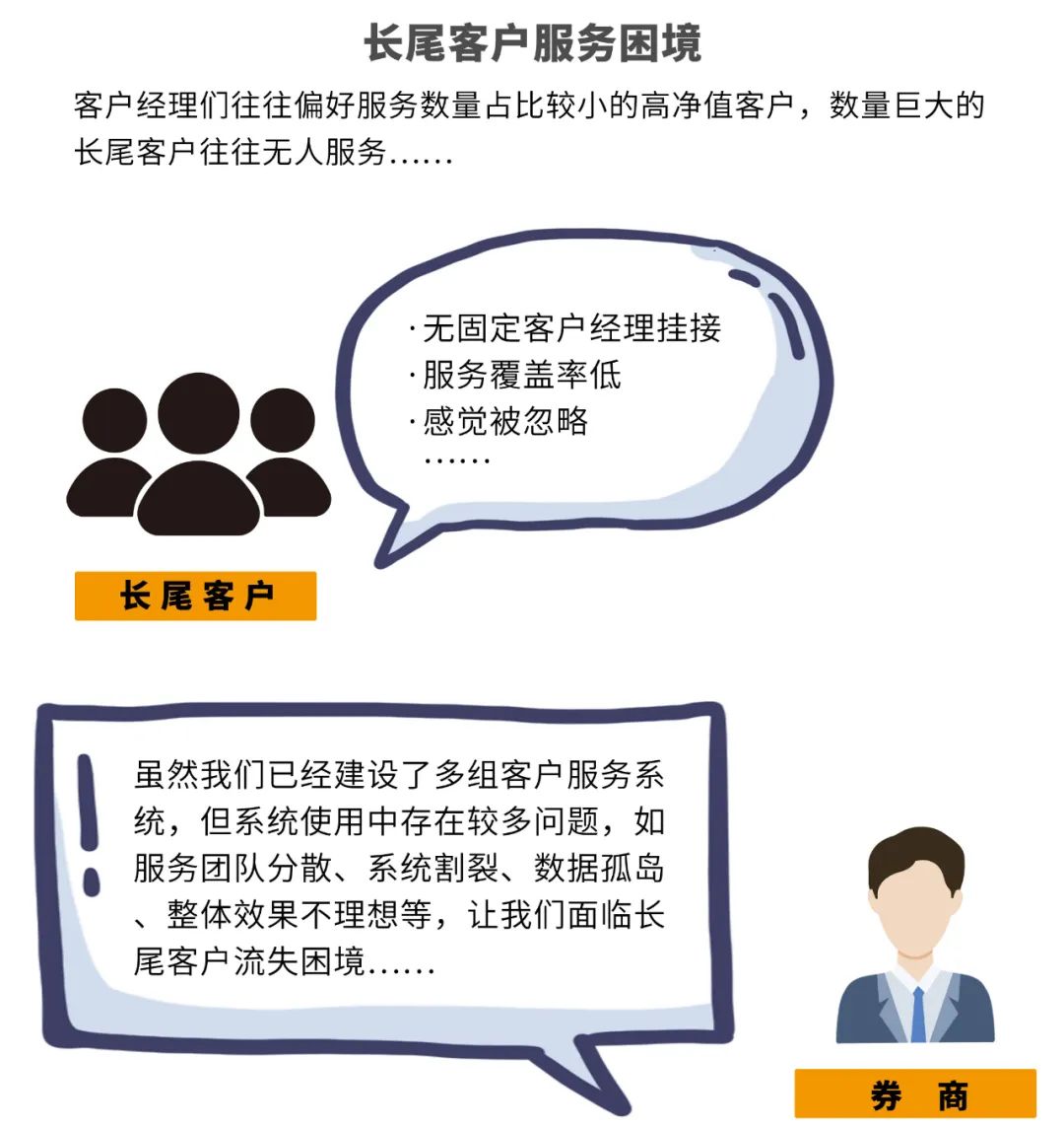 金融科技的應(yīng)用發(fā)展,推動證券行業(yè)獲客渠道向線上轉(zhuǎn)變,客戶增加呈跨越式增長。與此同時,數(shù)量巨大的客戶與券商有限的服務(wù)資源產(chǎn)生的矛盾愈演愈烈,導(dǎo)致大量的長尾客戶(中小客戶)缺乏優(yōu)質(zhì)服務(wù)。