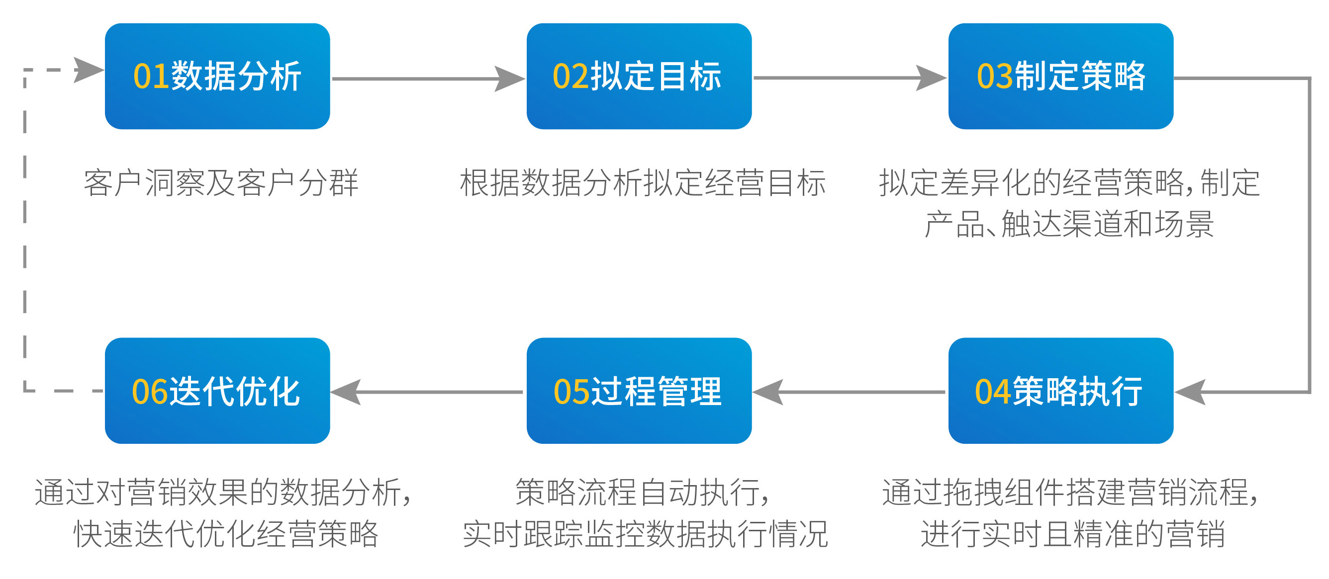 從識別客戶的相關(guān)標(biāo)簽和行為數(shù)據(jù)到對客戶的畫像分群,針對客群制定個性化的服務(wù)策略、配置渠道與內(nèi)容,在客戶關(guān)鍵場景下進(jìn)行線上或線下的運營觸達(dá)。