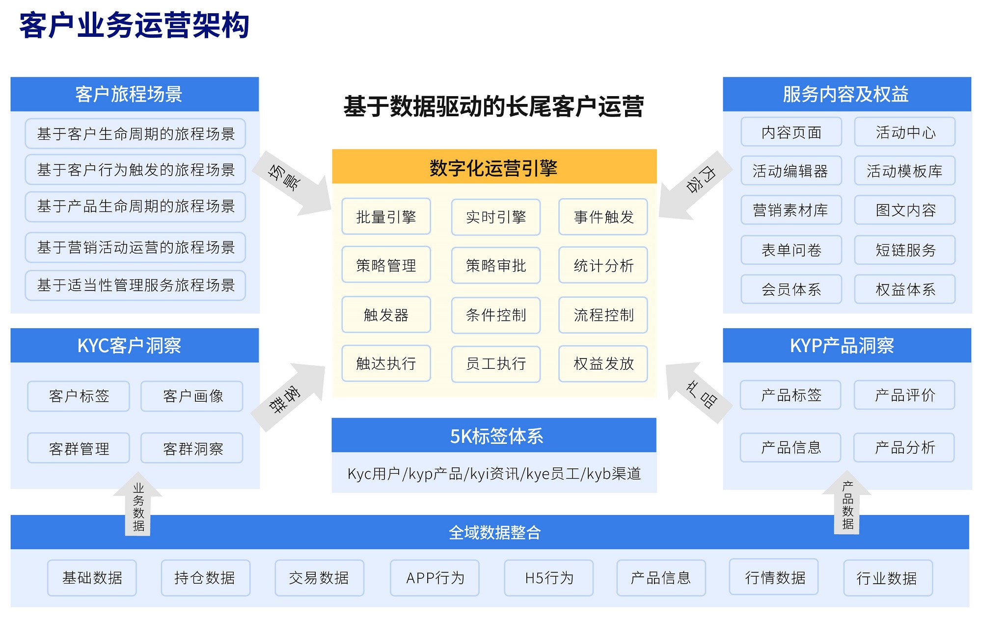 5K標(biāo)簽體系包括用戶、產(chǎn)品、資訊、員工、渠道等全方位的洞察,其中客戶洞察與產(chǎn)品洞察為客戶與產(chǎn)品的精準(zhǔn)匹配,為實現(xiàn)智能化客戶服務(wù)提供基礎(chǔ)數(shù)據(jù)。