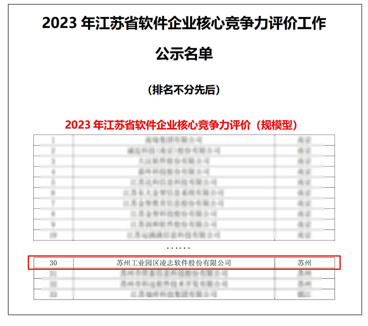 日前,江蘇省軟件行業協會發布“2023年江蘇省軟件企業核心競爭力評價工作”公示名單,從規模型、成長型、創新型、出口型、創新創業型五個細分領域評選出了核心競爭力強勁的頭部企業,并授予省級榮譽稱號。凌志軟件憑借扎實穩健的發展態勢和先進創新的研發實力成功獲評“2023年江蘇省軟件企業核心競爭力(規模型)企業”!