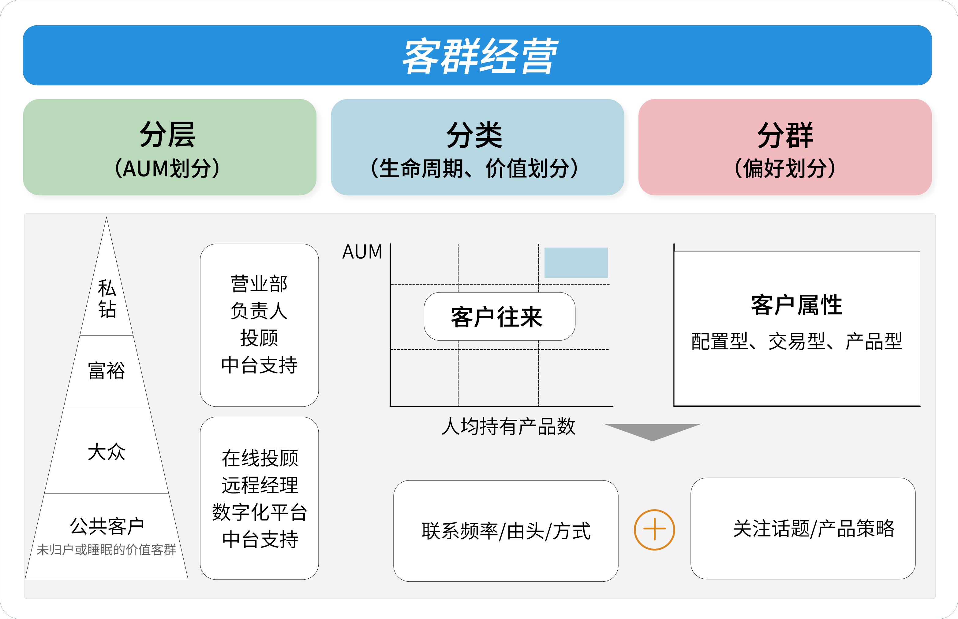 總分中臺從整體業績達成思路變革,搭建前中臺聯動、高效的營銷賦能體系,聚焦投顧服務視角,關注客戶AUM結構和資產配置需求。通過規范客戶經營流程,提煉標準化的營銷場景、策略以及展業工具賦能投顧,日常透過投顧的營銷過程追蹤管理,不局限于電訪、面談活動量,同時總分業務推動上為客群室和產品室提供基礎建設支持,包括客群結構檢視看板、策略指引的自動化匹配工具以及深度的產品與組合投研底層支持。